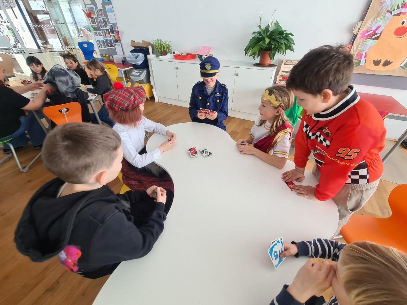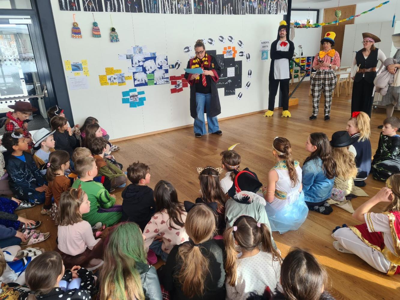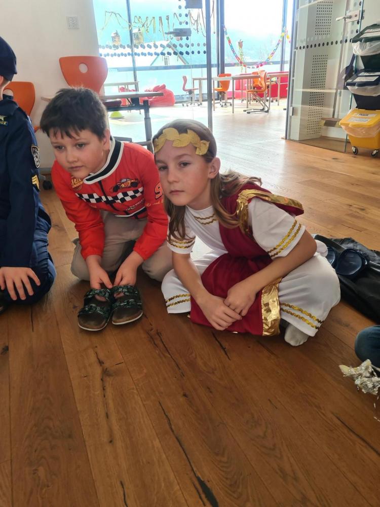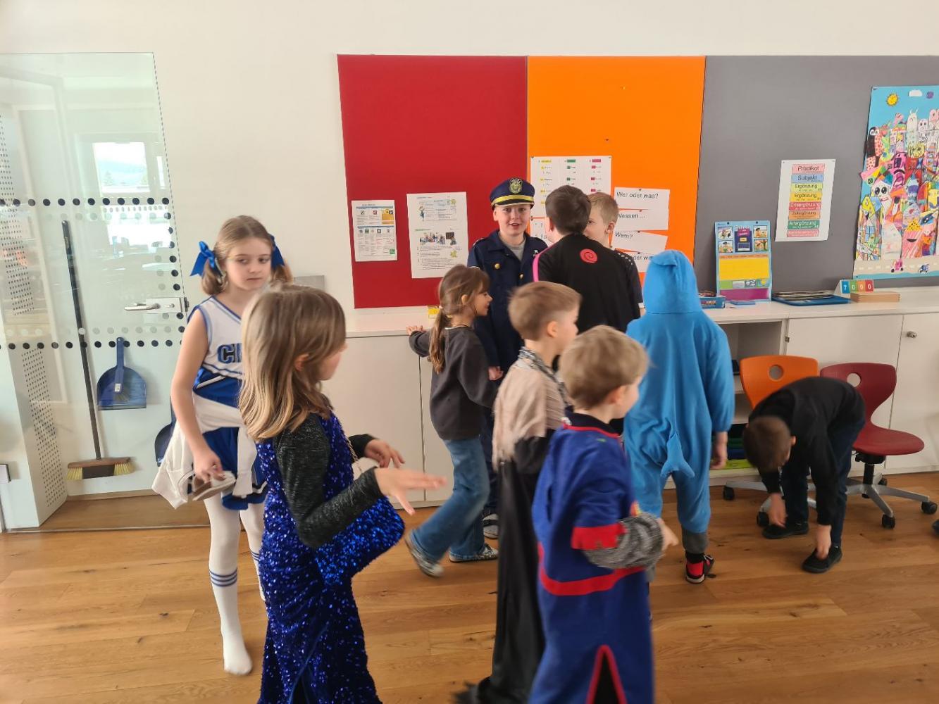 Die Faschingsfeier an unserer Schule war ein ganz besonderes Ereignis. Schon früh am Morgen des Faschingsdienstages kamen viele Schülerinnen und Schüler in fantasievollen Kostümen: Prinzessinnen, Piraten, Superhelden, Tiere und sogar ein paar kreative Eigenkreationen waren dabei. Die Gänge waren mit bunten, selbstgebastelten Girlanden geschmückt, was sofort für eine fröhliche Stimmung sorgte.