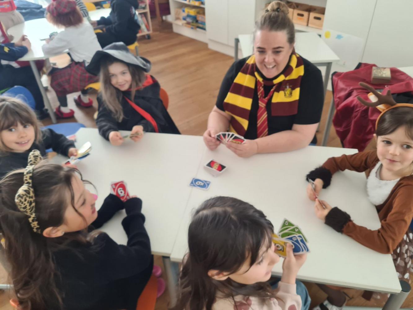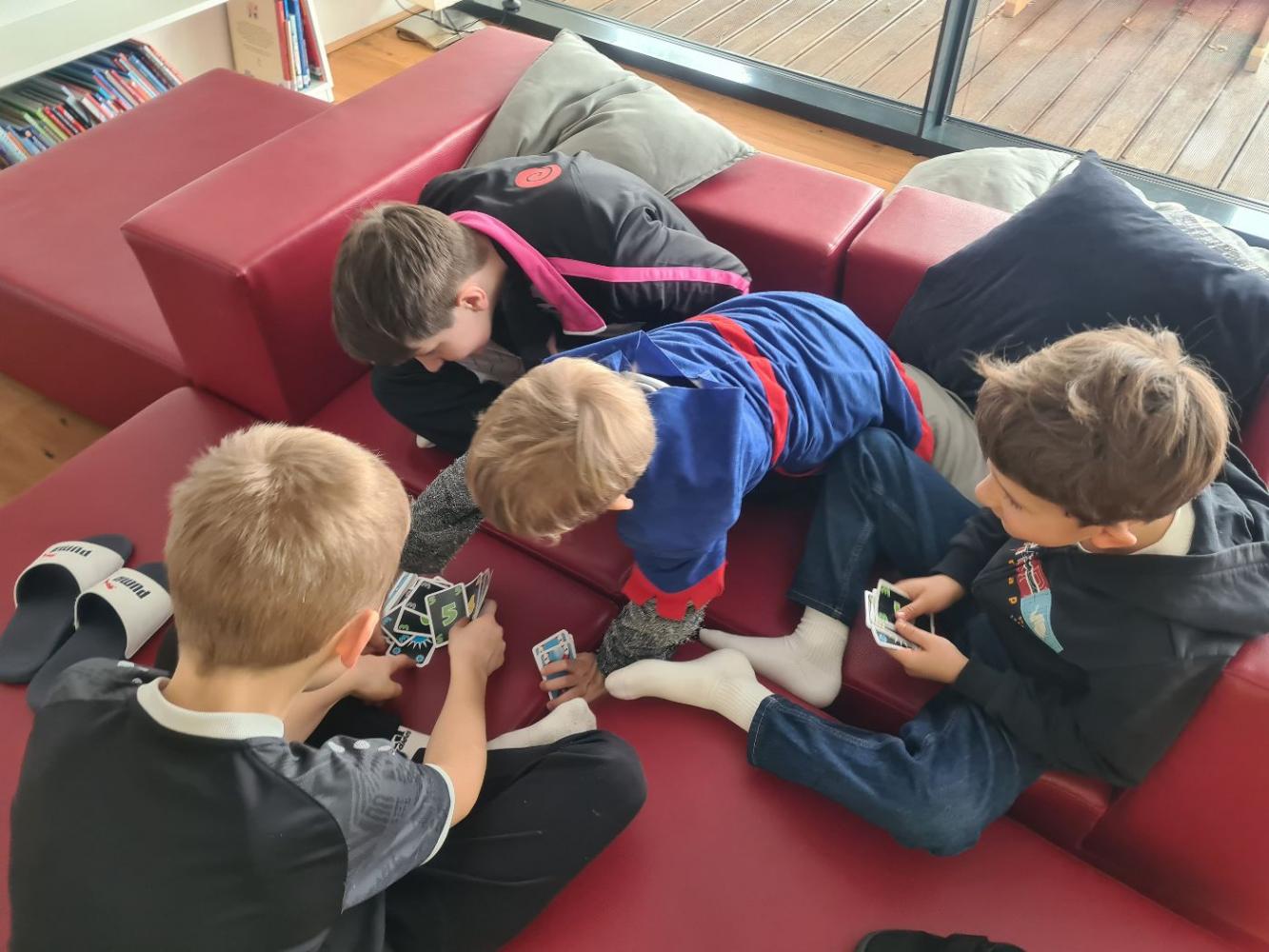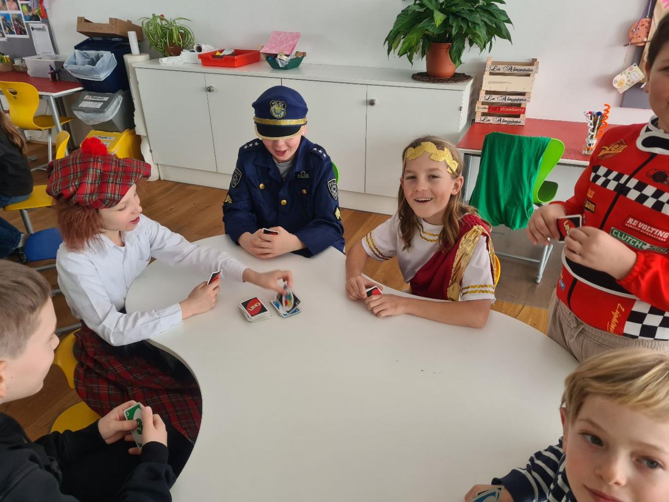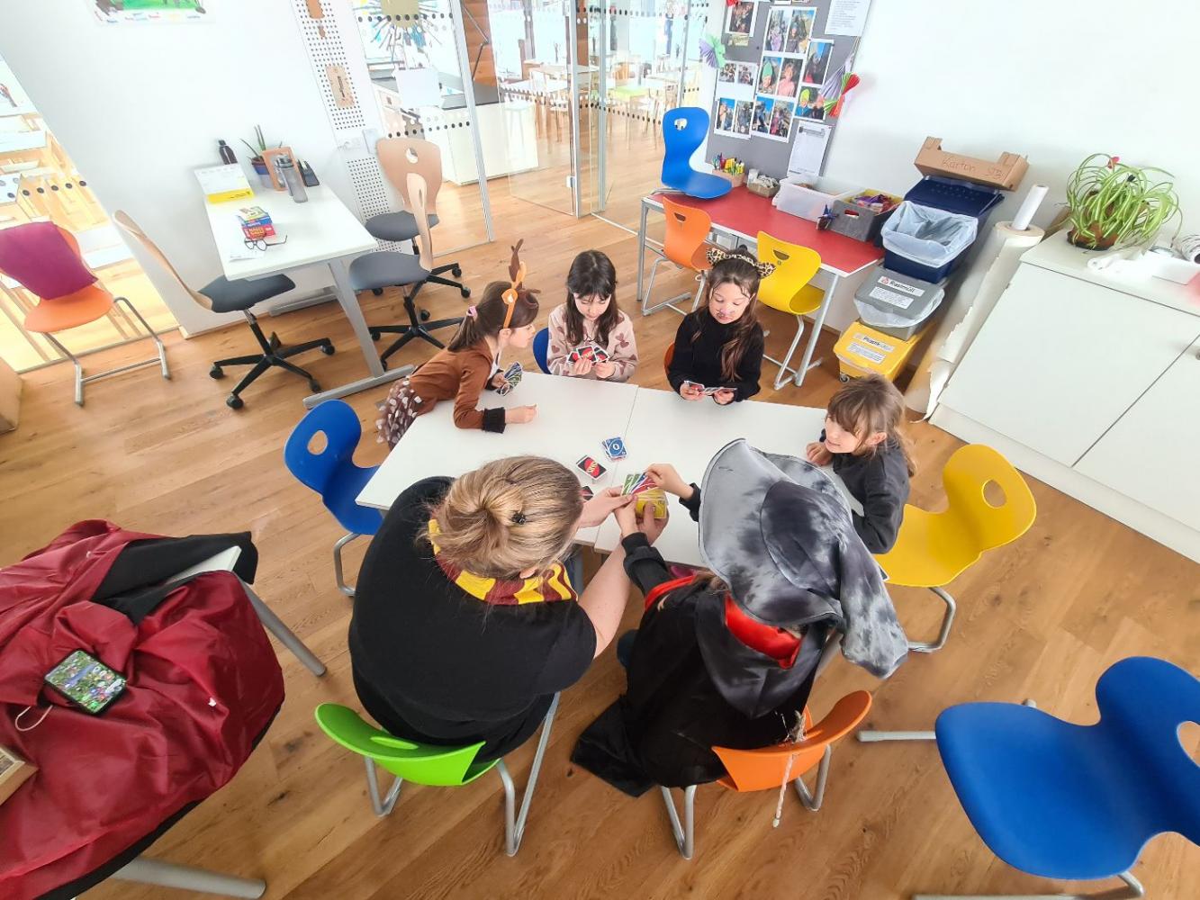 Bis zur großen Pause fand „normaler“ Unterricht statt. Nach der Pause wurden alle Kinder in 4 Gruppen eingeteilt. Jede Gruppe durfte dann gemeinsam der Reihe nach an vier verschiedenen Stationen, die von den Lehrer:innen betreut wurden, lustige Spiele und Aufgaben machen.