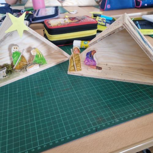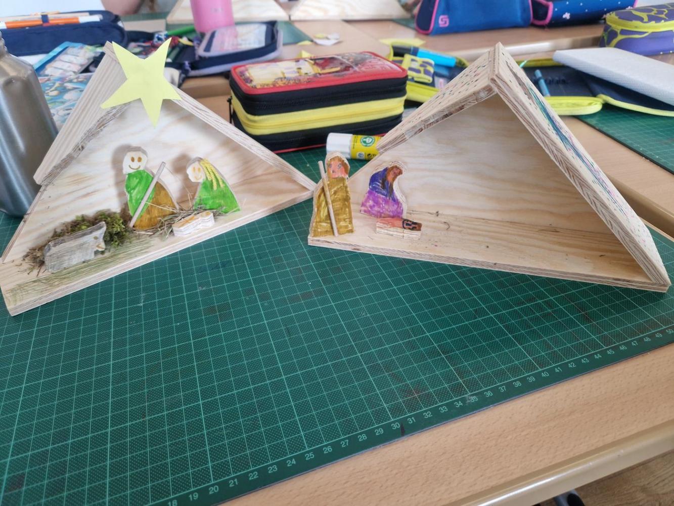 In der 2. Klasse wurde im Rahmen des Werkunterrichts in den letzten Wochen fleißig gesägt, geschliffen, geleimt und gestaltet. Bis die schönen Holzkrippen fertig waren, wurden viele Laubsägeblätter eingespannt und viel Schweiß vergossen. Doch die Mühe hat sich gelohnt, wie man an den Fotos sehen kann!